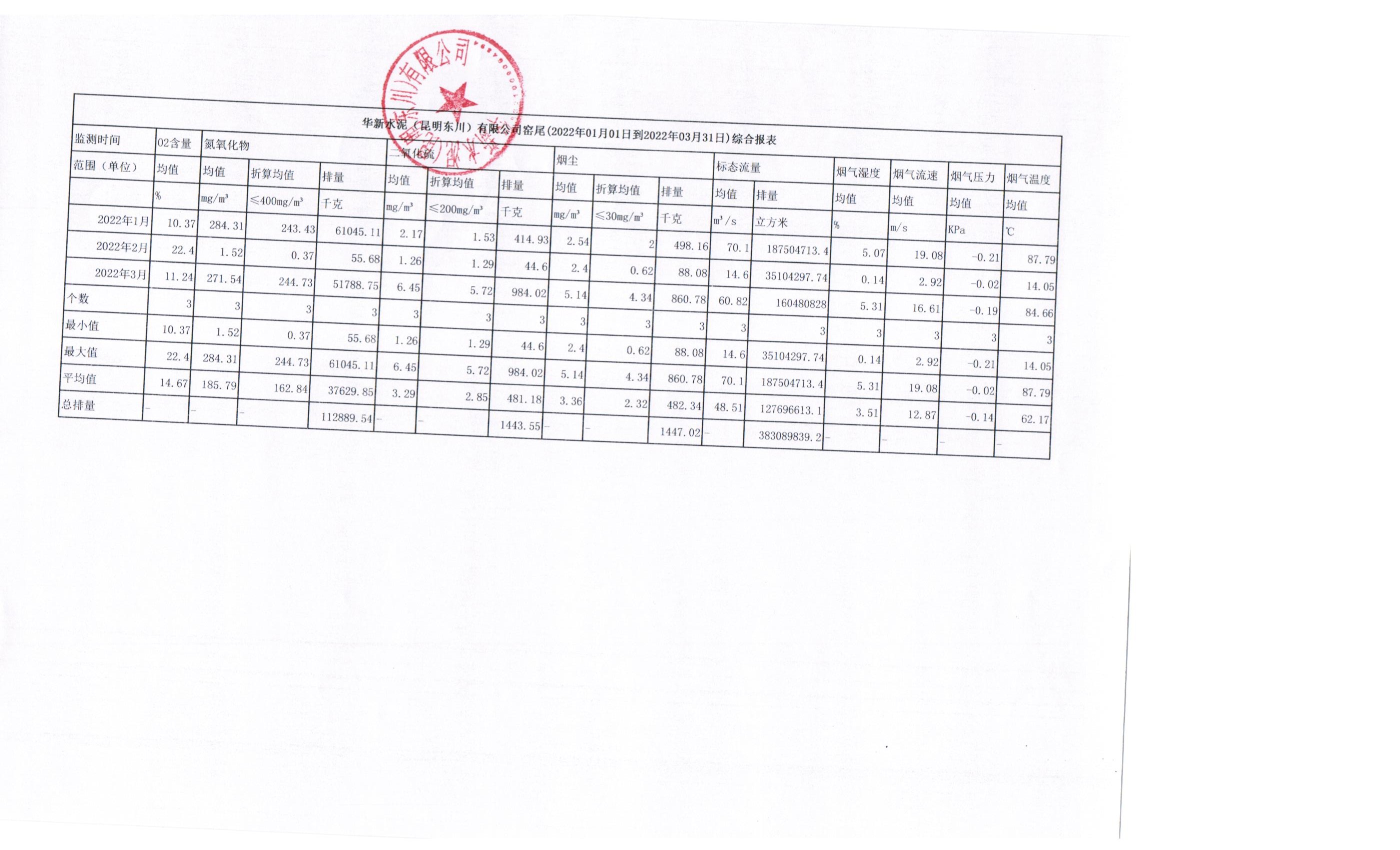 4、华新水泥(昆明东川)有限公司2022年第一季度窑尾烟气在线监测月平均值季报表